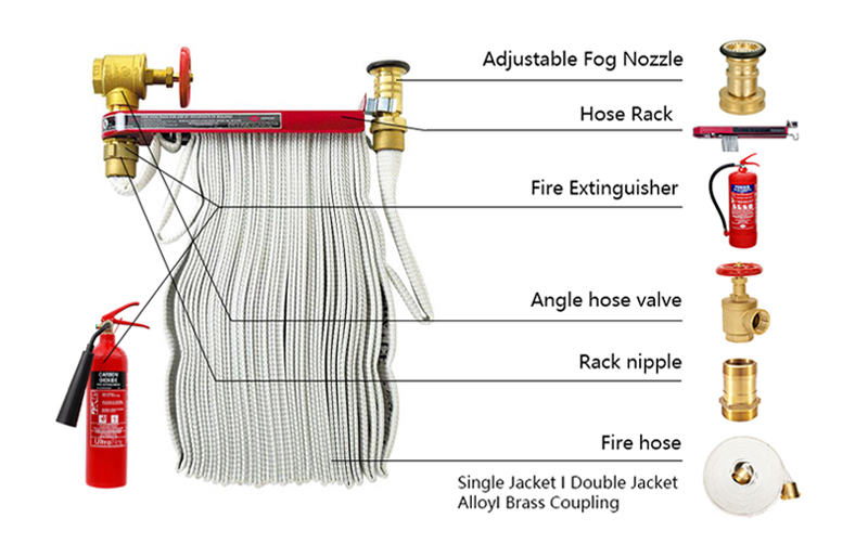 Rakitan ini terdiri dari 5 komponen inti, memastikan fungsionalitas lengkap: 1) Katup sudut selang (mengontrol aliran air ke sistem), 2) Nosel kabut yang dapat disesuaikan (menghasilkan aliran air yang fleksibel untuk berbagai skenario kebakaran), 3) Rak pin (menyimpan selang pemadam kebakaran dengan rapi agar mudah diakses), 4) Selang pemadam kebakaran dengan sambungan NH (terhubung dengan aman ke pasokan air dan nosel), dan 5) Nipple rak (menghubungkan katup ke rak selang). Biasanya dipasang di lemari pemadam kebakaran di setiap lantai gedung, rak ini menjaga peralatan pemadam kebakaran tetap teratur dan mudah diakses, sehingga menghilangkan keterlambatan dalam respons darurat.